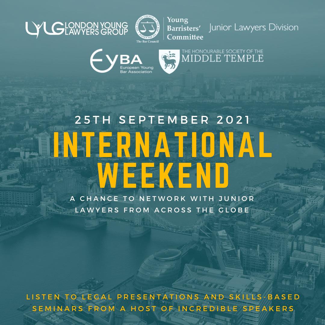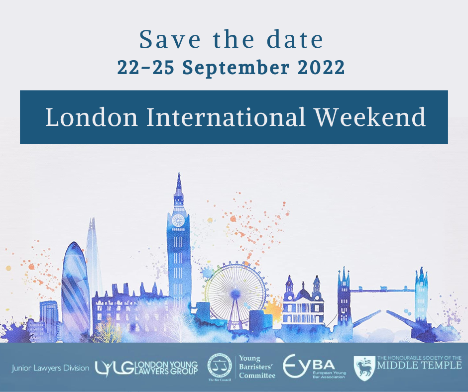 Since its creation, EYBA has organised three regular events per year. The International Weekend is usually held at the end of September. It always takes place in London and is organised jointly by the Junior Lawyers Division of the Law Society of England and Wales, the Young Barristers Committee of the Bar Council, the London Young Lawyers Group and the European Young Bar Association. A General Meeting of the EYBA is held to present any developments, in particular regarding the next Spring and Summer Conferences.